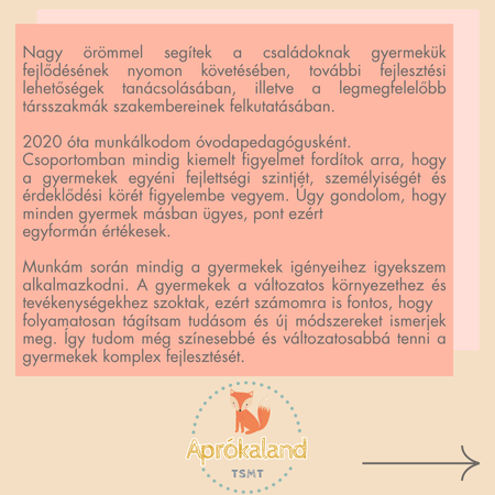 Szerencsésnek tartom magam, hiszen azzal foglalkozhatok, amit igazán szívből szeretek. Folyamatosan képzem magam, hogy a fejlesztőpedagógiai munkámat konkrét módszerekkel kiegészítve még hatékonyabbá tehessem. Fontosnak tartom, hogy a gyerekek motiváltan és jókedvűen vegyenek részt a foglalkozásokon, fejlesztő játékokkal élménypedagógiai elemeket felhasználva kapnak komplex fejlesztést. Arra fektetem a hangsúlyt, hogy érdekeljék, lekössék a játékos feladatok a gyerekeket, miközben számtalan tapasztalatot szerezhetnek a fejlesztő, iskolára felkészítő tevékenységek által.