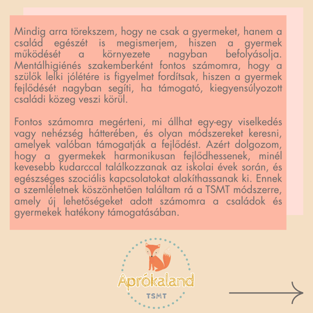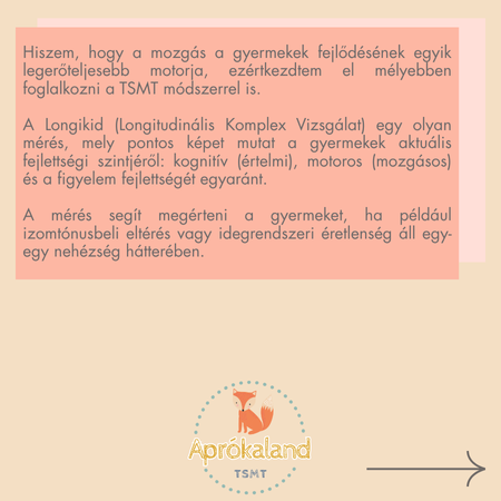 Saját gyermekeim születése által egyre jobban belemélyedtem a mozgásterápiák megismerésébe. Szerettem volna az ő fejlődésüket is már egészen pici koruktól segíteni. Így találtam rá a TSMT® terápia módszerére, ami a tervezett szenzomotoros tréning, Lakatos Katalin PhD által kidolgozott módszer. A TSMT® bemeneti Longikid® mérése által átfogó képet kapunk a gyermekek aktuális fejlettségi szintjéről, lehetőséget ad gyermekek idegrendszeri éretlenségből adódó tünetek csökkentésében, pszichés szociális, kognitív és motoros területen 3 hónapos kortól 11 éves korig.